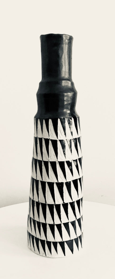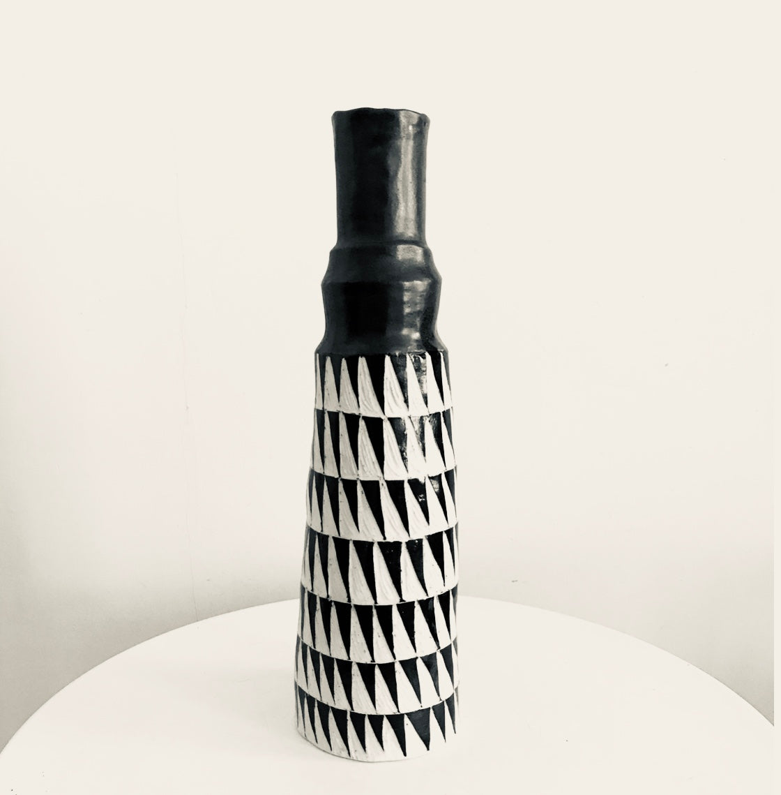 Strikingly graphic black and white ceramic vase handcrafted in a small studio in Brooklyn New York this vase is so sculptural that it doesn't even need flowers but just how beautiful will it look with some curly willow branches or a colorful bunch of your favorite flowers.