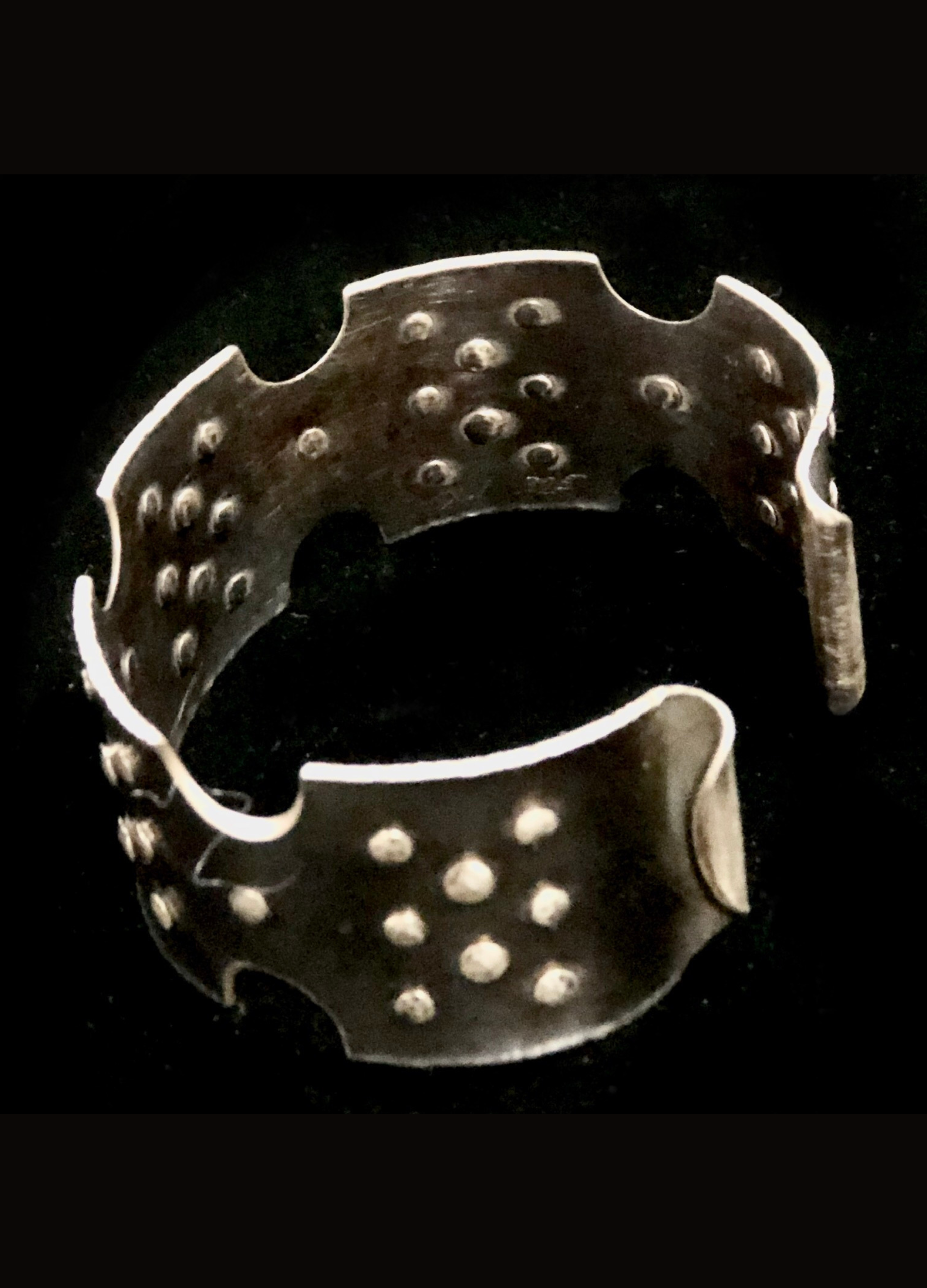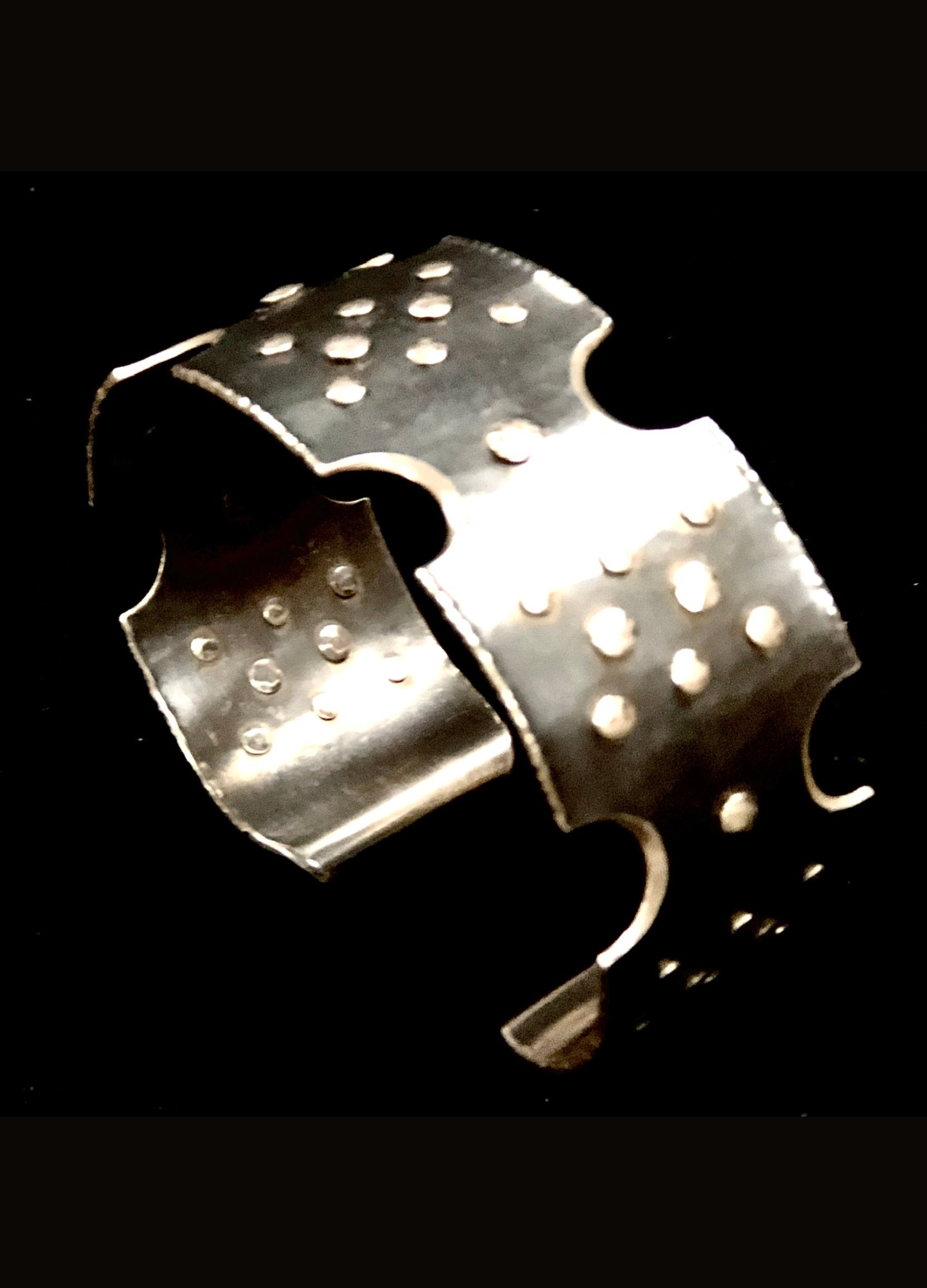 Hammered, oxidized sterling silver cuff (1" wide) with raised textured embellishments.