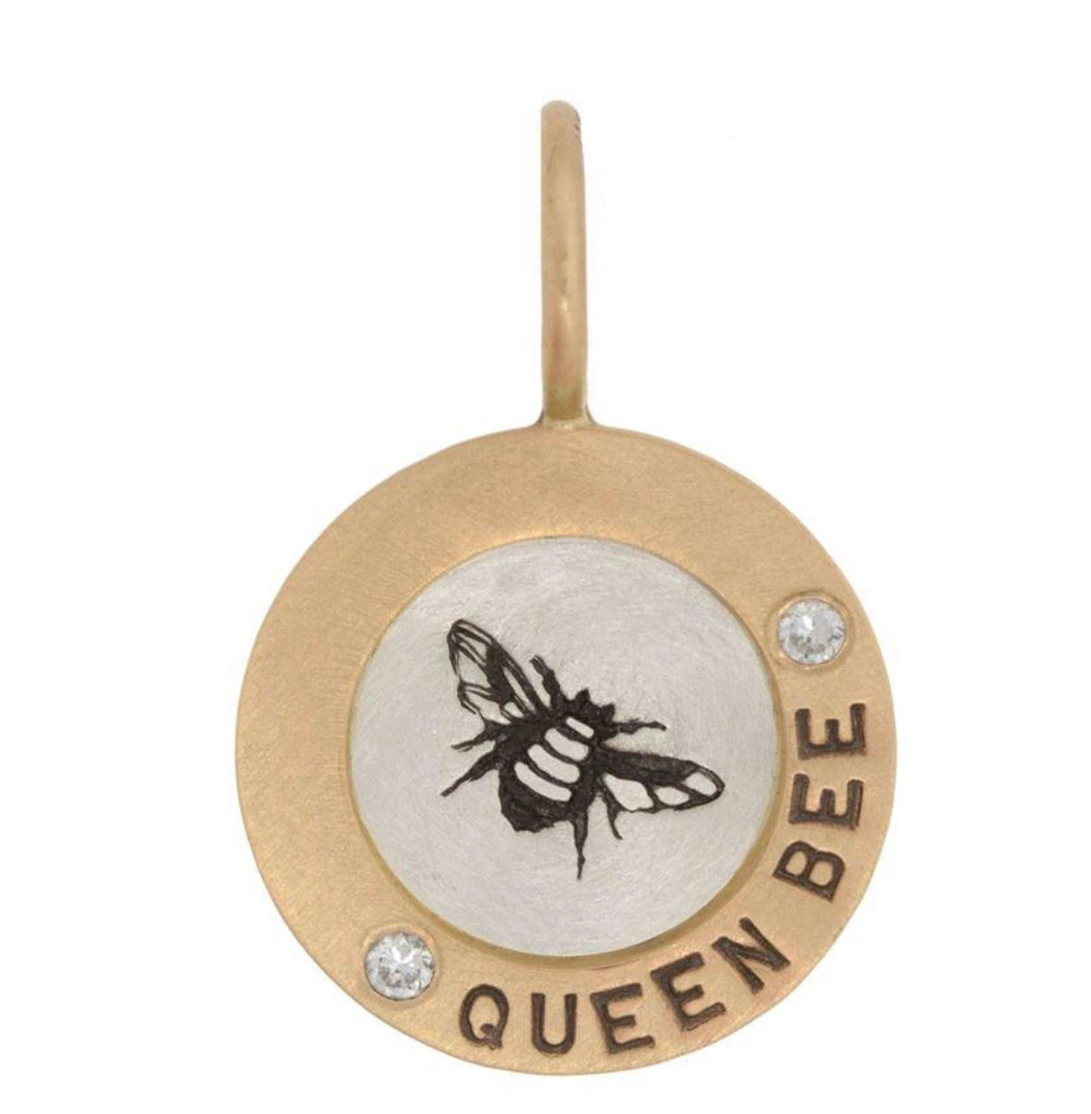 Sterling silver round charm with a wide 14K yellow gold frame and a 1.5mm white diamonds. Hand-stamped 'Queen Bee' and an illustrated bee.