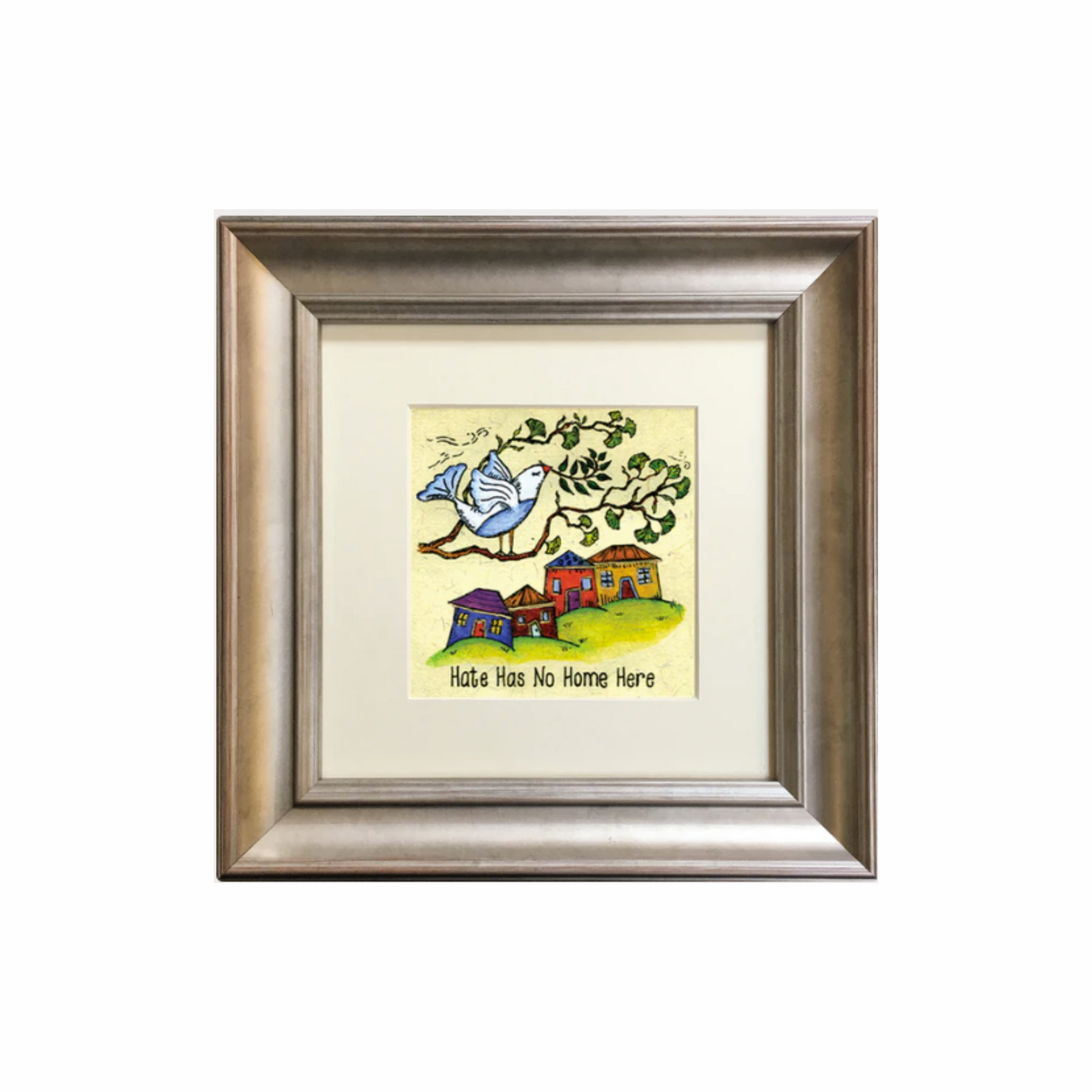 Each unique piece is created by combining intaglio printmaking onto handmade paper and original watercolor painting. Matted in silver leaf frame. 8" square