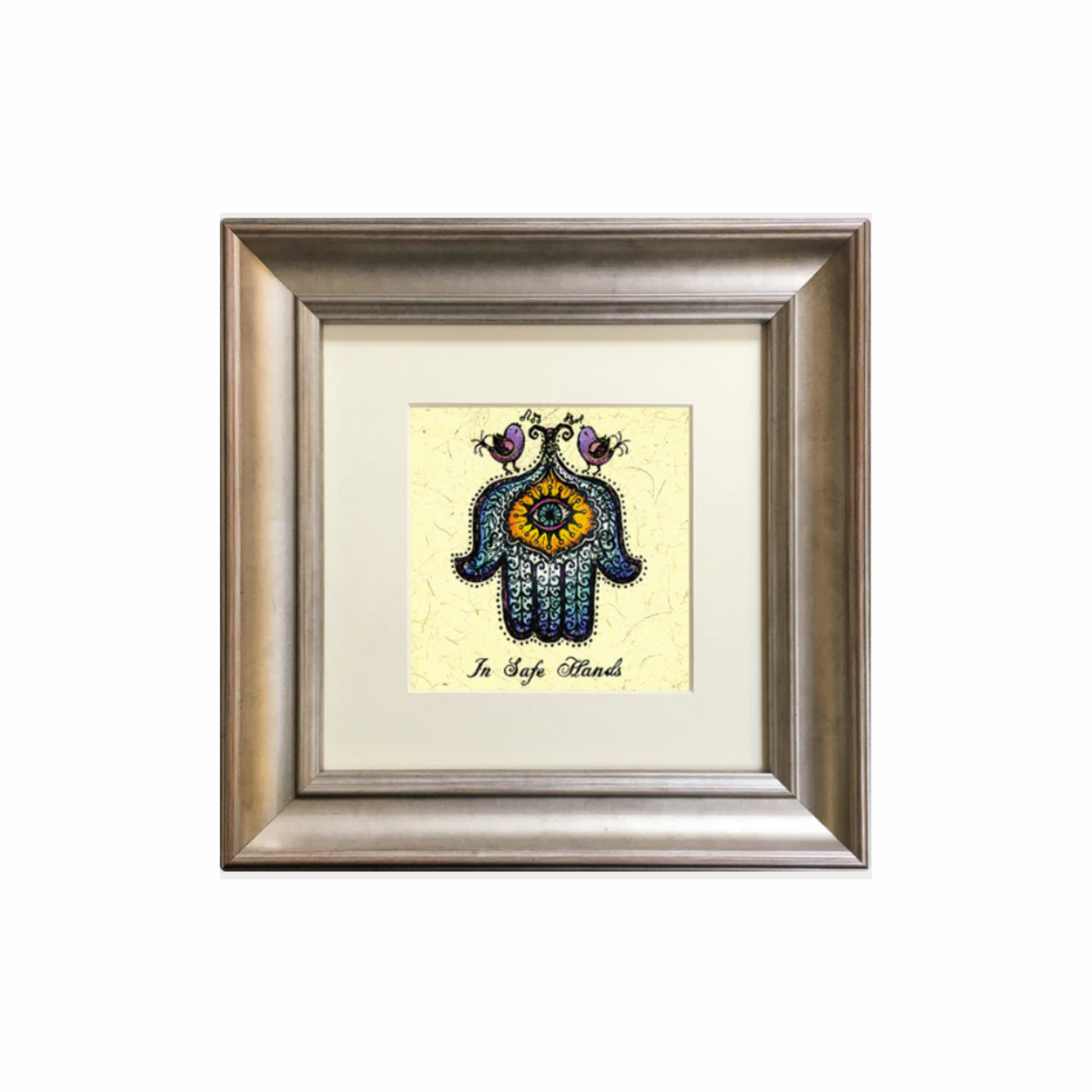 Each unique piece is created by combining intaglio printmaking onto handmade paper and original watercolor painting. Matted in silver leaf frame. 8" square