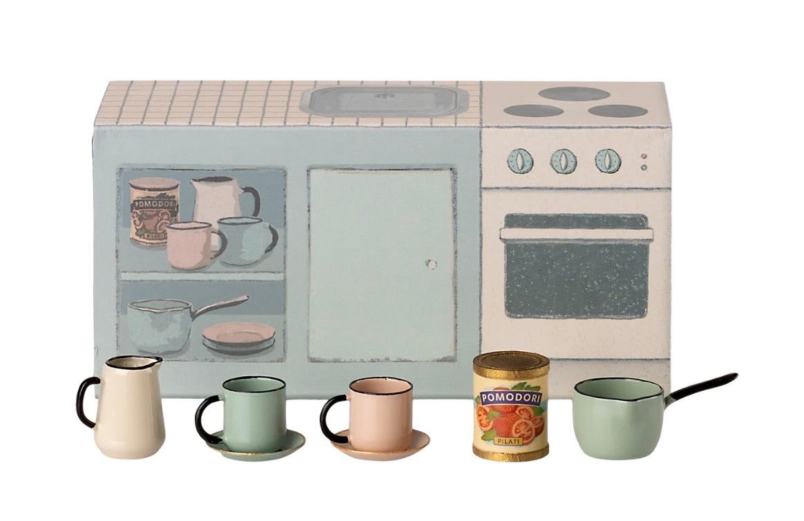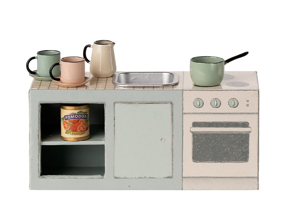 The small kitchen counter comes with 2 cups and plates, a pot and a pitcher and a small can of food. The sink is metal. Perfect for imaginative play.