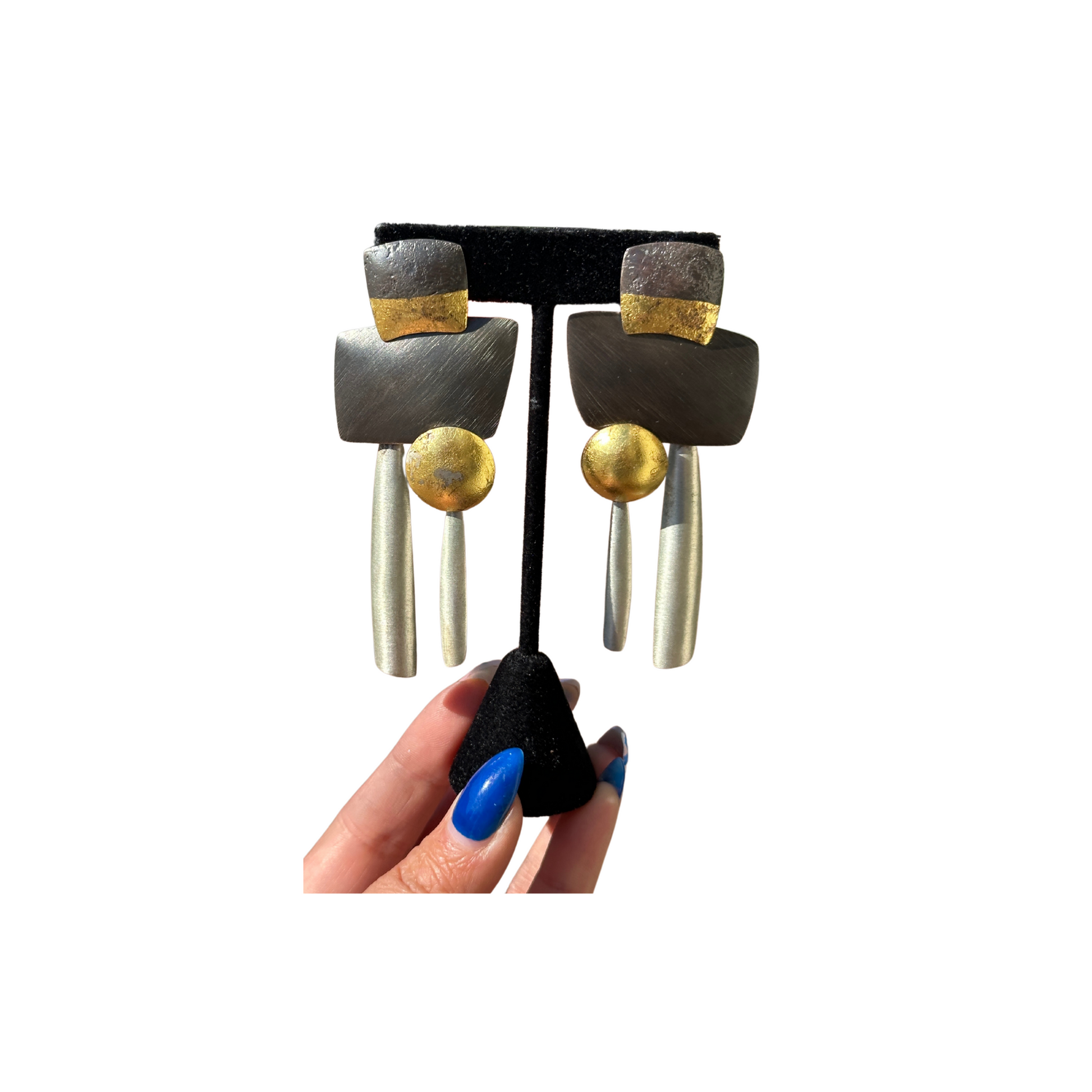 Irregular shapes forged from satin sterling silver, oxidized sterling silver, and 22k gold make up these 3.5" long post earrings.